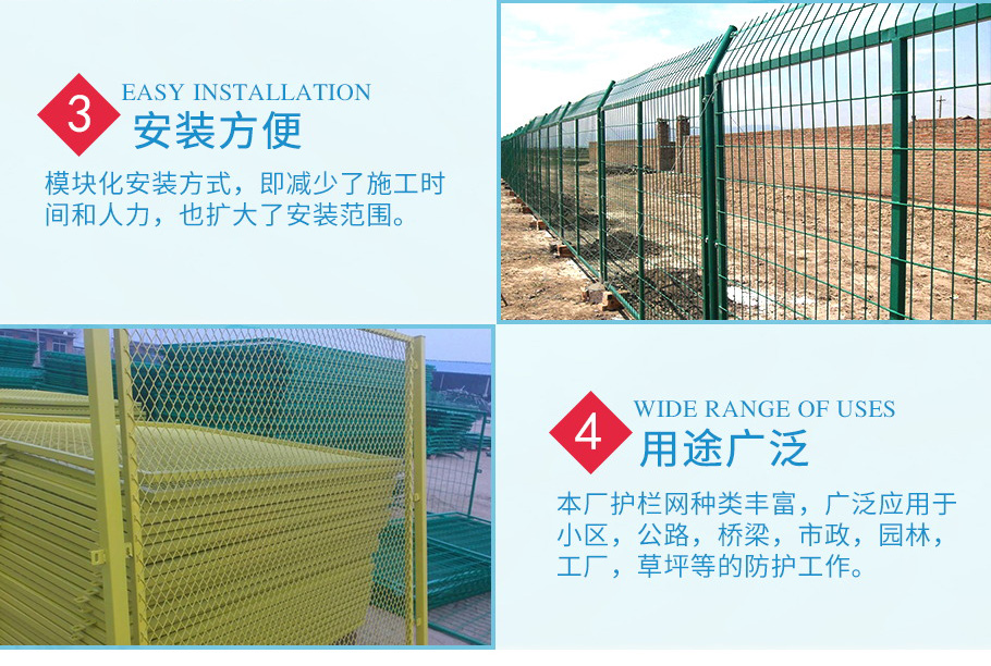 鐵路封閉網(wǎng)、生活區(qū)圍欄、場區(qū)圍網(wǎng)、開發(fā)區(qū)隔離網(wǎng)等等。